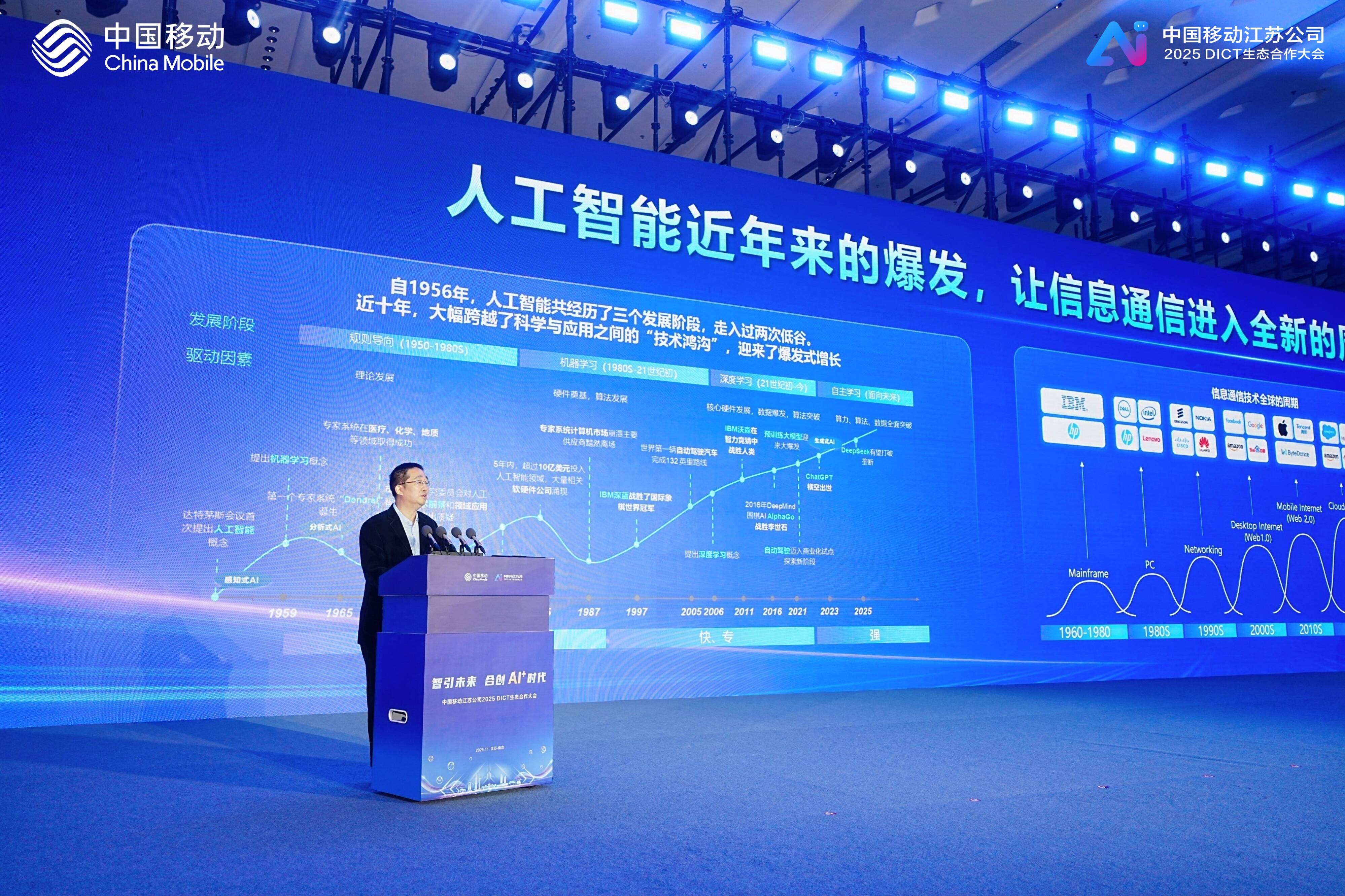 ? ? ? ?11月18日,中国移动江苏公司2025 DICT生态合作大会在南京召开。本次大会以“智引未来 合创AI+时代”为主题,汇聚了来自主管部门、研究院、产业伙伴及重要客户等千余位代表,共同探讨人工智能与DICT深度融合带来的新机遇,携手擘画智能时代下的产业合作新范式。
